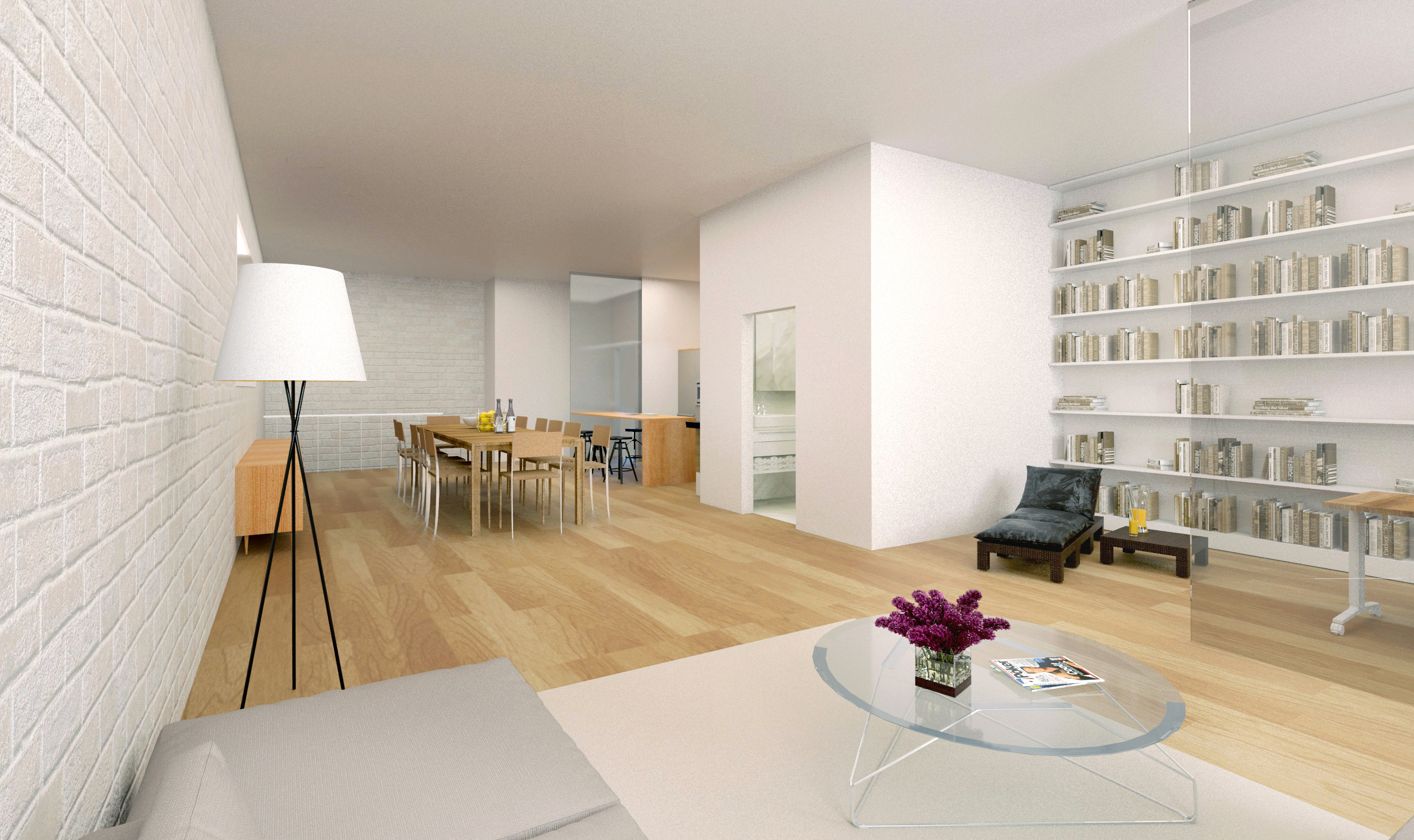 The Orwell House is a prewar building on the Upper East Side. Originally built in 1901 as a Piano Factory, this historic 5-story building was converted in 1980 to a loft building that houses 35 units. This loft was renovated on a very modest budget to accommodate the needs of a young family. Expansive 14 foot ceilings on the upper floor provide a spacious backdrop for entertaining. An open kitchen connects to a large dining area and living room. The stair leads down to a family room/ study, and 2 bedrooms, which receive natural light from a southern exposure
